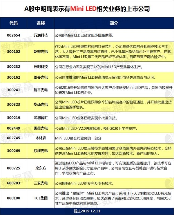 目前,涉及Mini LED的A股上市公司相对较少,上游芯片厂商三安光电和华灿光电等,作为Mini LED驱动产品目前已经进入出货阶段;中游封装厂商国星光电、瑞丰光电,其产品已经完成验收并开始出货;下游的面板厂商京东方明年将正式推出玻璃基板的MiniLED背光产品。TCL集团已展示15.6英寸Mini-LED笔记本显示屏。
