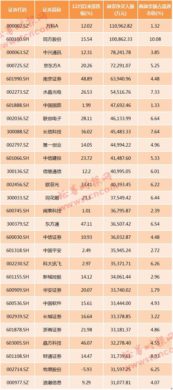 个股方面,12月以来,共有28股融资净买入净额超过3亿元。