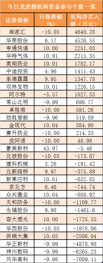 盘后龙虎榜数据显示,机构现身30股,其中御家汇等15股呈现机构资金净买入,风华高科等15股呈现机构资金净卖出。