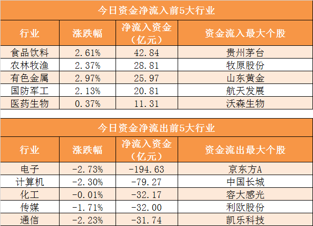 28个申万一级行业中,7个行业实现资金净流入,其中食品饮料行业净流入42.84亿元居首。