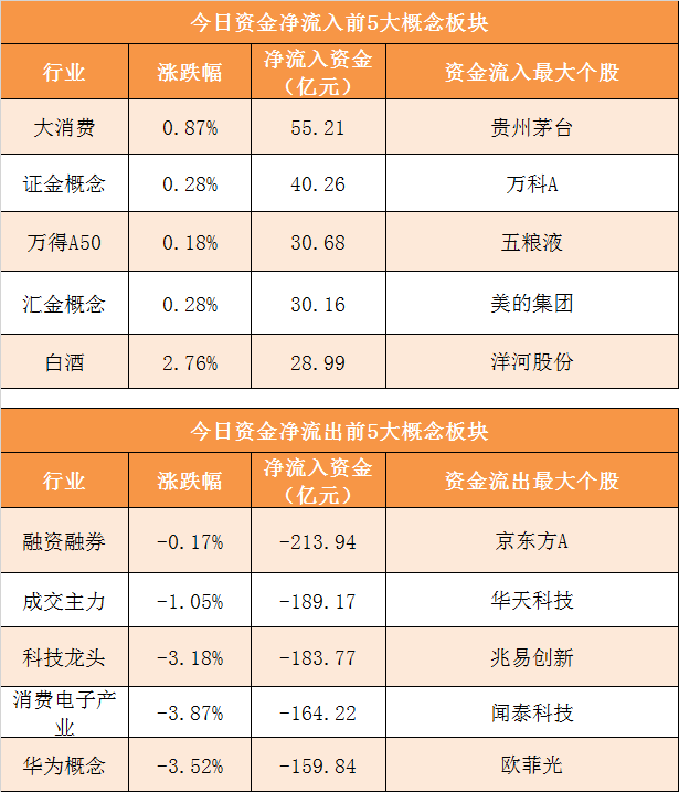 概念板块方面,今日大消费、证金概念、万得A50、汇金概念等概念板块资金呈现净流入,其中大消费概念净流入55.21亿元居首。