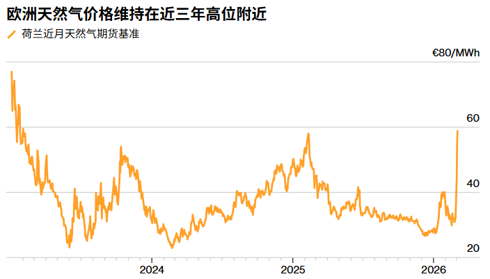随着中东冲突扩大,欧洲天然气价格延续了四年来的最大涨幅,这使得美国保护该地区关键油轮运输的计划黯然失色。截至发稿,荷兰近月天然气期货(欧洲天然气基准)上涨1.7%,至每兆瓦时55.23欧元。