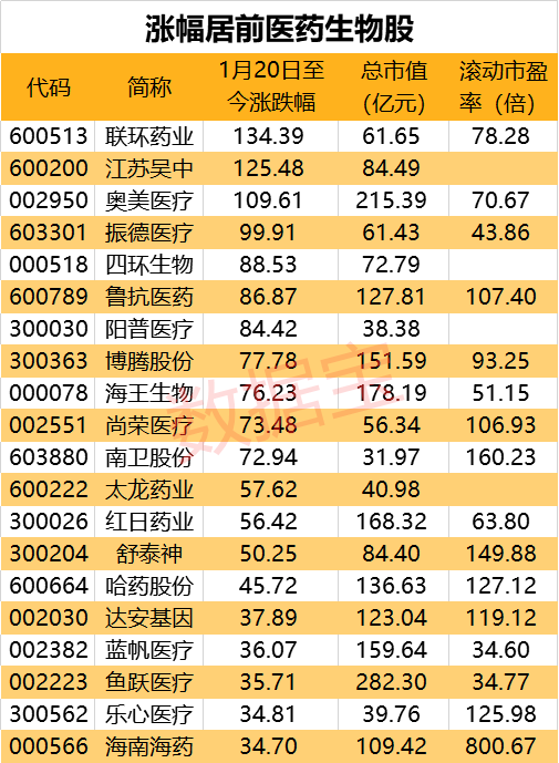 早在1月20日,医药生物股就涨势喜人,病毒检测产品、抗病毒等相关概念股全面爆发。1月21日,在大盘低开时,联环药业、鲁抗医药、莱茵生物、达安基因、科华生物、四环生物等股票均出现涨停。随后的1月22日、23日,医药生物股涨势继续。证券时报·数据宝统计显示,自1月20日以来,剔除科创板,医药生物股市值飙升1544亿元。