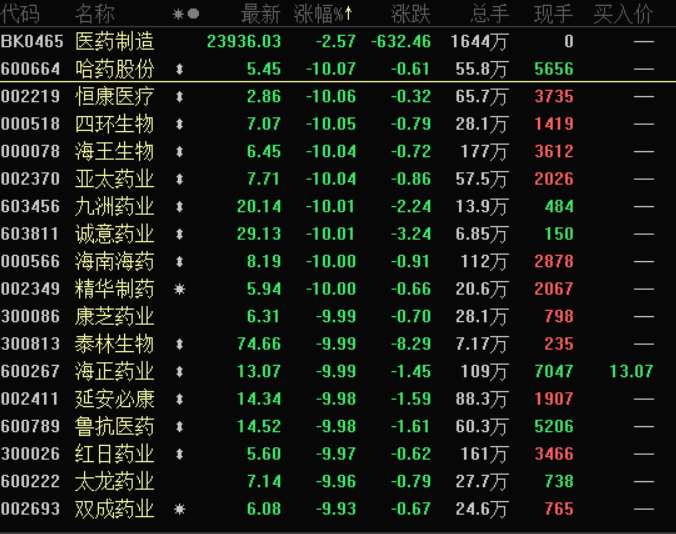 继上周五回落后,前期强势涨停的医药生物股,今天多股跌停,鲁抗医药、四环生物、太龙药业等股票封住跌停,申万医药生物板块跌幅1.28%,领跌沪深两市。