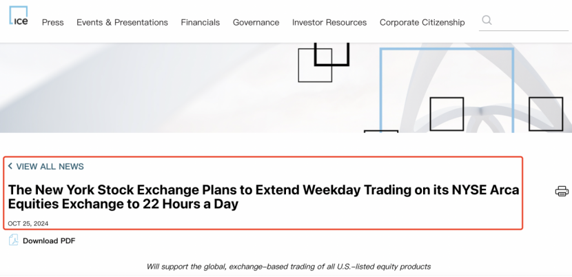 而在几日之前,美国纽约证券交易所发布公告称,计划将旗下全电子化交易所NYSE Arca的美股交易时间延长至每个工作日22个小时,待监管批准后实施。