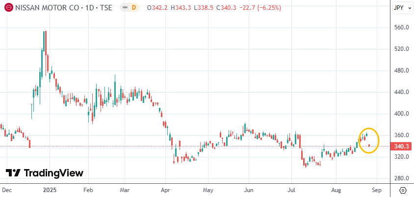 今年7月时,美国总统宣布将日本汽车的进口关税从27.5%下调至15%,这一消息一度导致日产股价明显反弹。即便如此,目前日产的市值仍只有80亿美元,与之相比,丰田为2600亿美元。