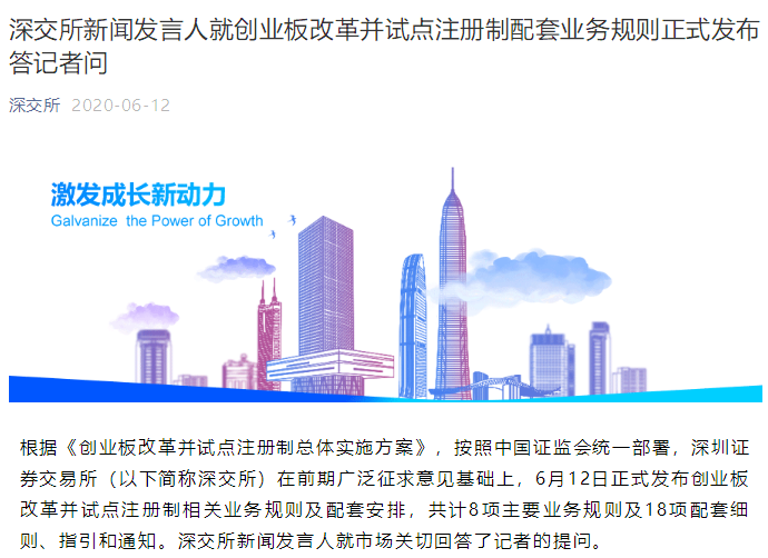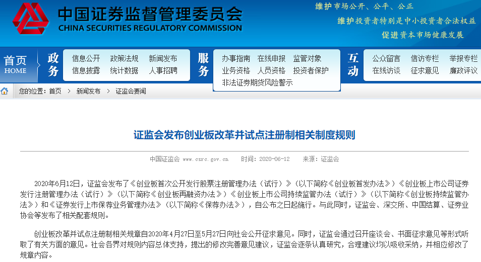 6月12日晚间,证监会发布了《创业板首次公开发行股票注册管理办法(试行)》(简称《创业板首发办法》)《创业板上市公司证券发行注册管理办法(试行)》(简称《创业板再融资办法》)《创业板上市公司持续监管办法(试行)》(简称《创业板持续监管办法》)和《证券发行上市保荐业务管理办法》(简称《保荐办法》),自公布之日起施行。