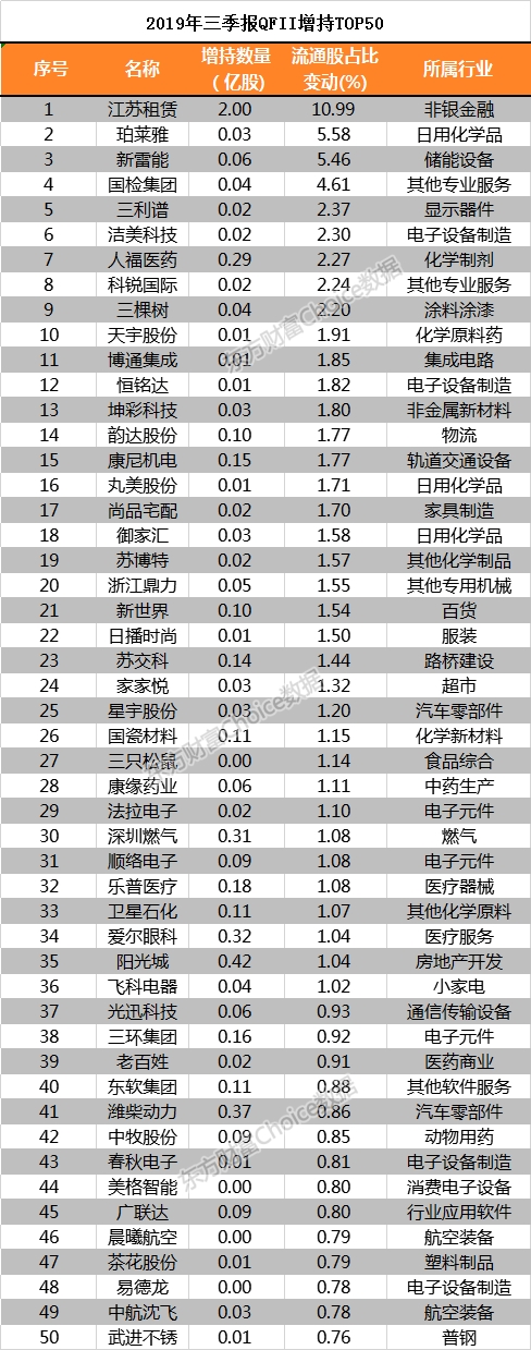 而QFII又增持了哪些股呢?东方财富Choice数据显示,截至2019年三季报,QFII增持比例最高的个股也多集中在医药、消费和科技板块,但也有非银金融板块的江苏租赁、和钢铁板块的武进不锈。