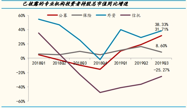 数据显示,在各主要投资者中,2019年前三季度,外资持股总市值增速最快,高于公募及险资;公募和保险持股总市值保持正增长;信托持股总市值同比仍下滑。