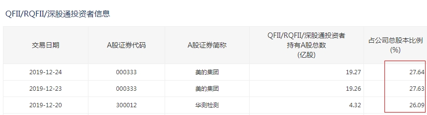 根据深交所最新数据显示,截至12月25日,QFII/RQFII /深股通投资者持有美的集团的股份数量占总股本的比例已经高达27.64%,距离28%的禁买线仅一步之遥;持有华测检测的的比例也已高达26.09%。