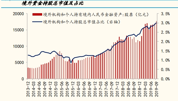 自2013年12月中国人民银行开始披露境外资金持股市值,据国金证券测算,截至今年三季度,按流通市值口径计算,外资持有股票资产为1.76万亿元,其中,QFII&RQFII持股0.60万亿,陆股通持股1.16万亿。