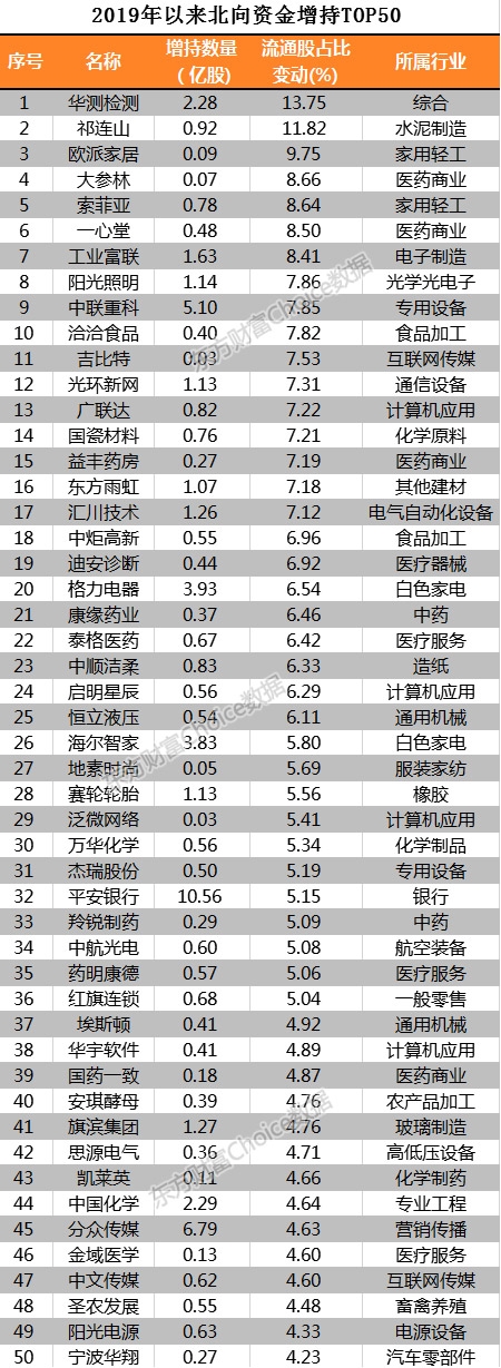 东方财富Choice数据显示,2019以来截至12月27日,按持股数量占流通股比变动排序,华测检测、祁连山、欧派家居、大参林、索菲亚、一心堂、工业富联、阳光照明等17只个股获北向资金增持比例超7%,其中华测检测更是超过了13%。