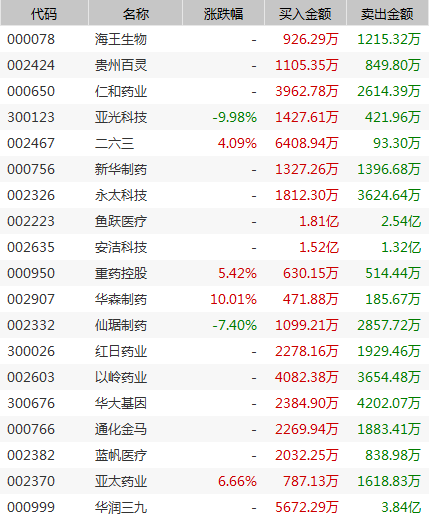 龙虎榜数据显示,深股通专用席位买入18股,卖出3股,涉及海王生物、仁和药业、新华制药、重药控股、华润三九、鱼跃医疗、永太科技、仙琚制药、亚太药业、蓝帆医疗、贵州百灵、二六三、以岭药业、华森制药、红日药业、亚光科技、华大基因、宁德时代等公司;买入金额31.81亿元,卖出金额22.59亿元,净买入金额9.22亿元。