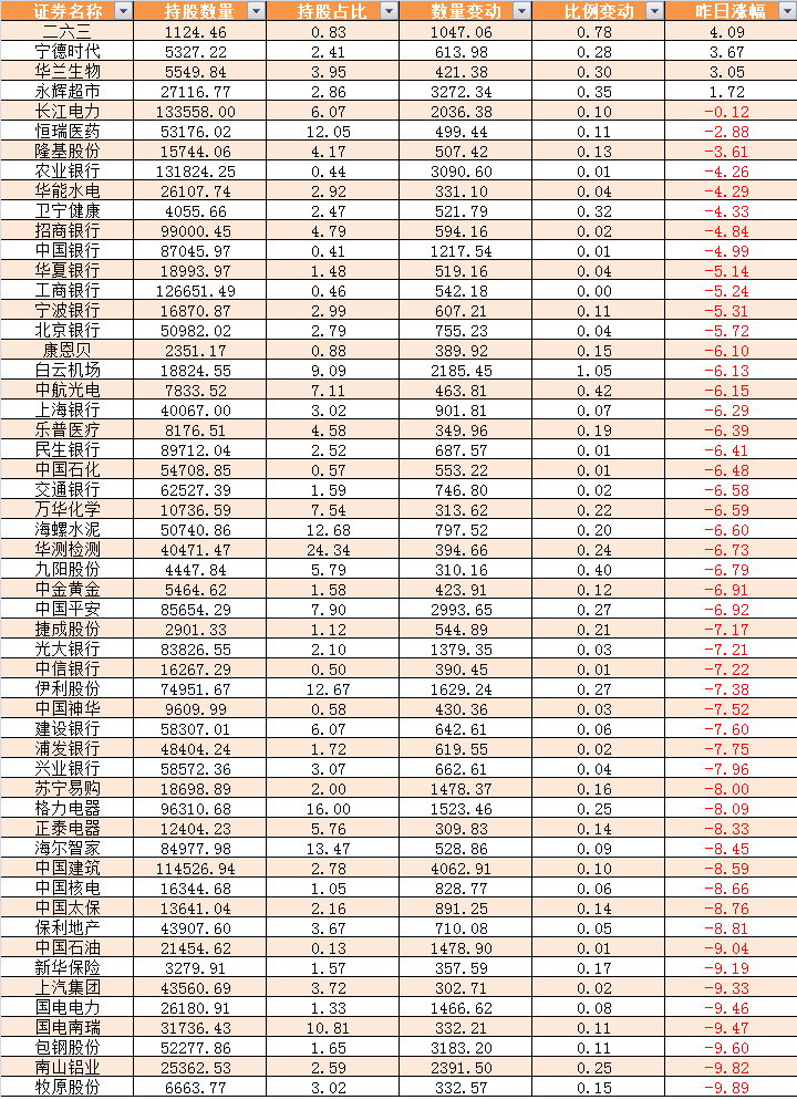 共有108只个股北向资金加仓超过300万股,上述个股中真正跌停的个股只有50%左右,50余只个股抗住了跌停压力,二六三、宁德时代、华兰生物、永辉超市逆市飘红,长江电力微跌0.12%,恒瑞医药、隆基股份、农业银行、华能水电 、卫宁健康、招商银行、中国银行跌幅在5%以内。