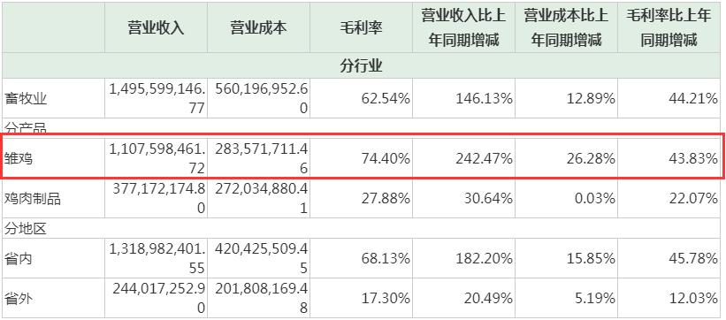 不过,养鸡行业内部存在毛利率高低的分化。同样是8月20日晚,温氏股份(300498)也披露了半年报,虽然归属于上市公司股东的净利润为13.83亿元,同比增长了50.76%,但公司肉鸡类养殖的毛利率仅14.36%。