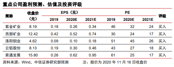 核心关注铜铝公司中具备较大业绩弹性和明确产量增速的标的,重点推荐紫金矿业、西部矿业、洛阳钼业、云铝股份、索通发展。