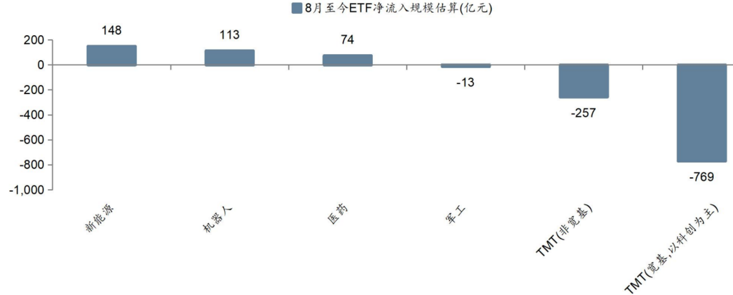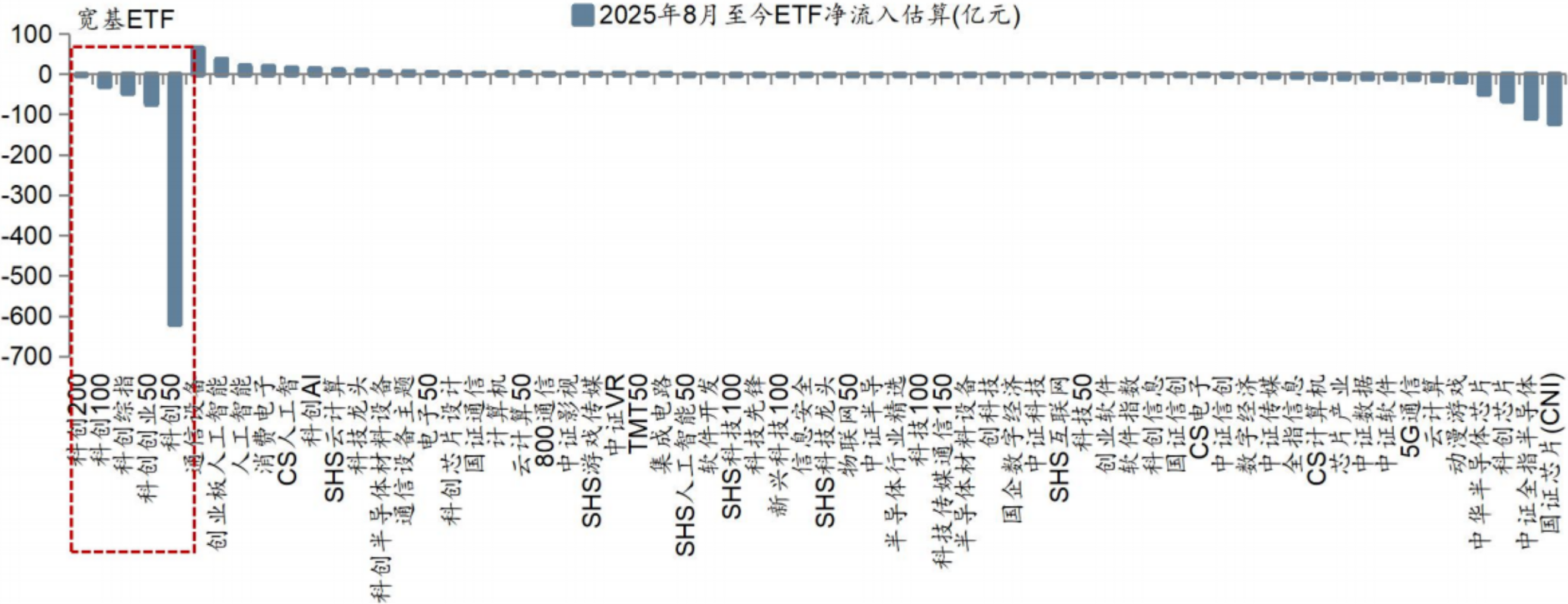 2025年8月以来,科技ETF整体还是净流出的、新发的主动权益也不明显。其中非宽基的赛道ETF净流入约66亿(包括医药、新能源、机器人、创新药等),TMT的ETF净流出250亿(非宽基),TMT的宽基ETF净流出约769亿(科创50ETF净流出620亿)。