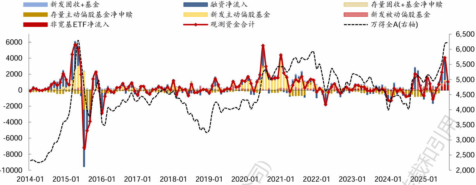 由于每一轮牛市发展的背景不同,居民每轮牛市入场的渠道并不相同: 14-15 年主要依靠杠杆资金,各类型的金融创新工具及宽松的融资环境,驱动增量资金以加杠杆的形式入市; 20-21年主要依靠主动偏股基金,以茅指数、宁组合为代表的赛道行情成为市场主线,外资与主动公募审美共振,居民借道主动权益基金入场,进一步推升蓝筹股与赛道股行情;25年本轮行情,从目前跟踪来看资金面的重要变化主要集中于杠杆资金、ETF、固收+等,而主动权益的资金流入尚不明显。