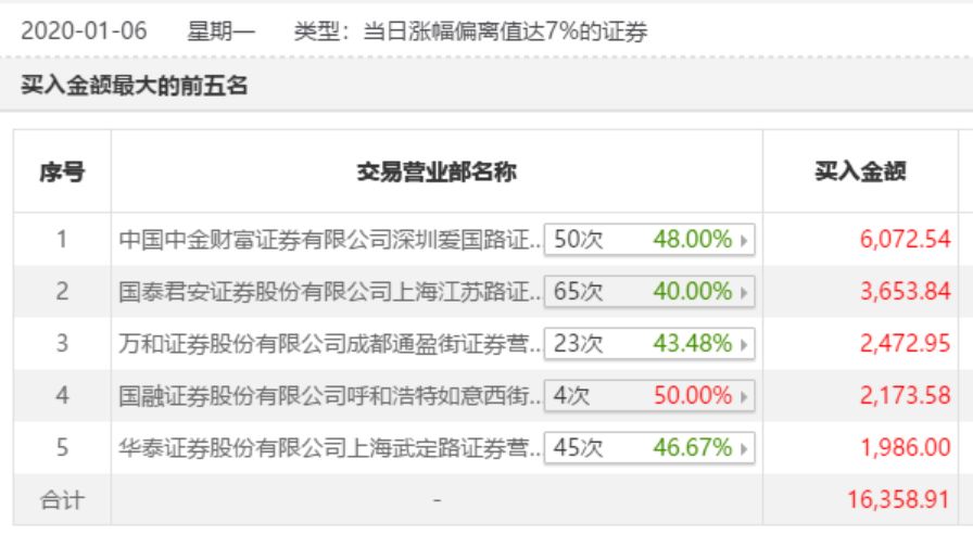中国中金财富证券深圳爱国路证券营业部排在第一,买入金额为6072.54万元;国泰君安上海江苏路证券营业部排在第二,买入金额为3653.84万元;华泰证券上海武定路证券营业部排在第五,买入金额为1986万元。