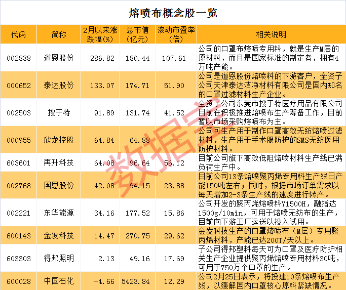 证券时报·数据宝统计发现,目前A股市场上有涉及熔喷布业务的上市公司共计10家,分别是道恩股份、再升科技、欣龙控股、泰达股份、金发科技等。从二级市场表现来看,除了直接生产口罩的公司,口罩原材料熔喷布相关的公司股价也是持续火爆。数据显示,2月以来,7只熔喷布概念股累计涨幅在30%以上,其中道恩股份累计涨幅286.82%遥遥领先。在此前很长一段时间,道恩股份表现平平,自鼠年春节后股价迅速蹿升,成为市场最大热门股之一。