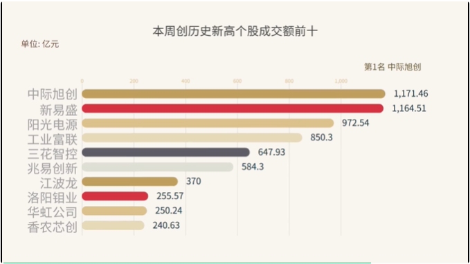 从成交额看,上述107只个股中,本周成交额居前的个股为中际旭创、新易盛、阳光电源、工业富联、三花智控,成交额分别为1171.46亿元、1164.51亿元、972.54亿元、850.3亿元、647.93亿元。