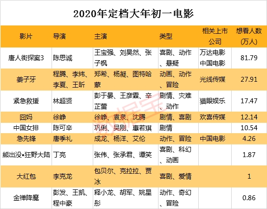 其一、影视题材各具千秋。9部影片囊括了悬疑、奇幻、冒险、喜剧、灾难、动画类。其中,《唐人街探案3》及《姜子牙》猫眼电影想看人数最多,前者超过80万,此前两部唐人街探案票房成绩都十分可观;后者在《哪咤》上映期间有一定宣传,想看人数接近28万。《中国女排》以真实事件改编,宣扬中国女排精神,同样值得期待。