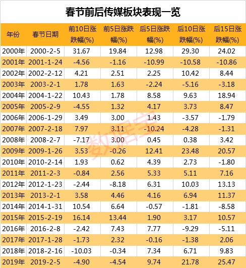 历史数据回测显示,在春节档前后5日内,传媒板块走势十分强劲,而在春节后,这种上涨行情会随着影片的上映会持续一段时间。