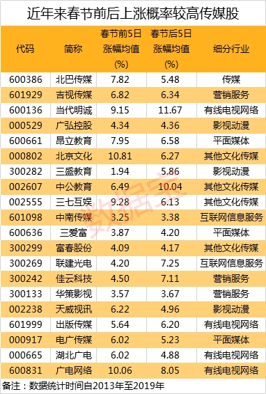 从历史数据来看,以2013年至2019年的市场表现来看,有20股在春节前后5个交易日的上涨概率均超过85%,包括北巴传媒、北京文化、吉视传媒、当代明诚等。前2股在春节前5日均实现上涨,后2股在春节后5日均实现上涨。其中,北巴传媒绝对属于“闷声发大财”类型,自2013年以来,历年春节前后5个交易日均实现上涨。北京文化春节前5日平均涨幅较高,达到10.81%,当代明诚春节后5日平均涨幅较高,达到11.67%。