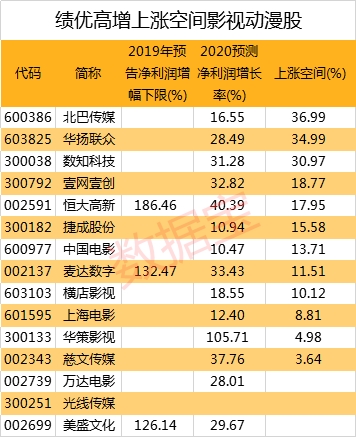 上涨空间来看,北巴传媒、华扬联众及5G股数知科技上涨空间均超过30%,华为国产软件概念股捷成科技上涨空间超15%;业绩来看,恒大高新、麦达数字及美盛文化2019年净利润增幅下限均超过100%。另外,机构预测华策影视、慈文传媒、麦达数字明年净利润增幅均有望超30%。