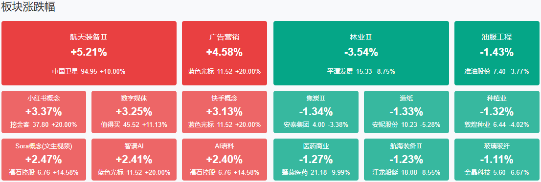 沪指早盘窄幅震荡,创业板指冲高回落跌超1%。沪深两市半日成交额1.31万亿,较上个交易日放量176亿。盘面上热点快速轮动,全市场超3000只个股下跌。从板块来看,AI应用端持续拉升,万事利、德生科技、蓝色光标等多股涨停。商业航天概念反复活跃,雷科防务3连板,顺灏股份、北斗星通、长江通信涨停。机器人概念局部活跃,锋龙股份6连板,五洲新春3连板续创历史新高。下跌方面,福建板块下挫,鹭燕医药跌停,平潭发展、合兴包装、海峡创新大跌。