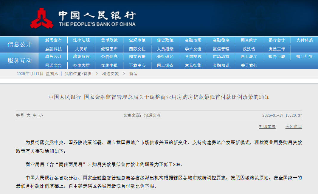 中国人民银行、国家金融监督管理总局发布《关于调整商业用房购房贷款最低首付款比例政策的通知》。