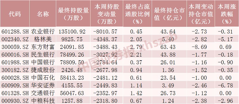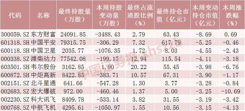 本周北向资金减持流通股比例居前十个股 来源:Choice