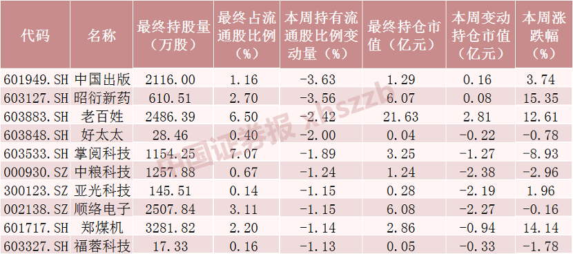从持有流通股比例情况来看,Choice数据显示,本周北向资金对14只个股的持有流通股比例减少1%以上,其中对中国出版持有流通股比例减少最多,达3.63%,对昭衍新药持有流通股比例减少3.56%,此外,北向资金对老百姓、好太太的持有流通股比例减少超过2%。