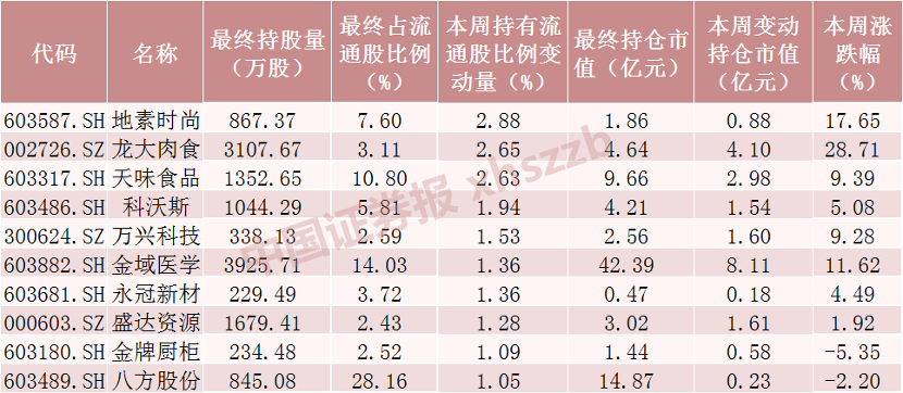 从持有流通股比例情况来看,Choice数据显示,本周北向资金对10只个股的持有流通股比例增加1%以上,其中对地素时尚、龙大肉食、天味食品持有流通股比例增加超过2%,分别增加2.88%、2.65%、2.63%。