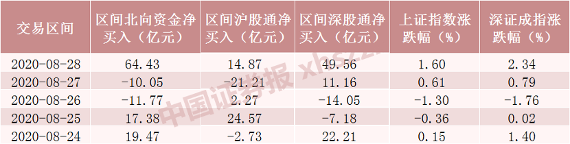 具体来看,Choice数据显示,8月24日北向资金净流入19.47亿元,8月25日净流入17.38亿元,8月26日净流出11.77亿元,8月27日净流出10.05亿元,8月28日净流入64.43亿元。