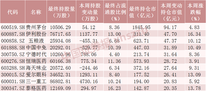 从持仓市值变动情况来看,Choice数据显示,本周北向资金对20只个股的持仓市值增加超过10亿元,其中对贵州茅台、伊利股份、五粮液、中国中免、宁德时代持仓市值增加金额居前,分别增加94.17亿元、47.70亿元、47.37亿元、31.89亿元、31.64亿元。但是,本周北向资金对五粮液和中国中免均减仓,持仓市值增加是这两只个股本周上涨超过10%所致。