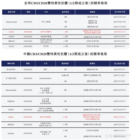 除了嘉和生物的GB261外,截至目前,全球还有五个处于1/2期或之后临床阶段的CD3/CD20 TCE,而中国则还有8个处于1/2期或之后临床阶段的CD3/CD20 TCE。值得一提的是,已上市的CD3/CD20均为国际巨头或药企间联合开发,嘉和生物依靠自研实力,其GB261处于1/2期阶段,研发进度处于靠前位置。