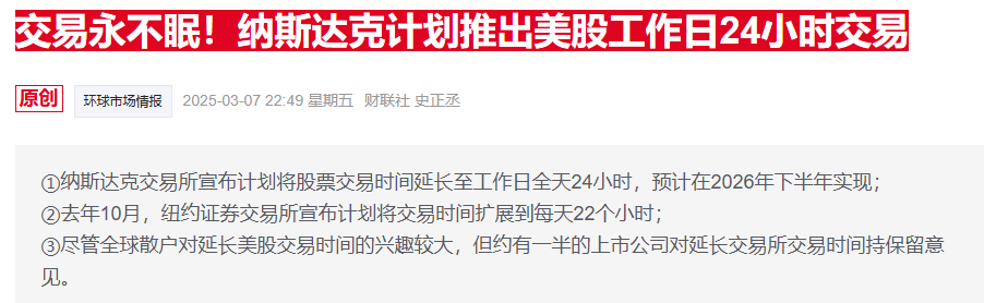 财联社今年3月报道就提到,纳斯达克交易所曾宣布推动股票交易时间全天24小时,以抓住全球对美股日益增长的需求。纳斯达克预计,在获得监管批准并与行业其他参与方完成协调的前提下,最早可于2026年第三季度初实现。