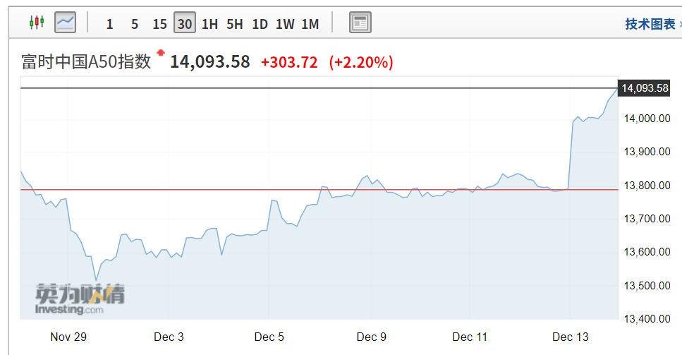 此外,欧洲股市也全面开花,英法德三国股市均上涨近1%。美股短线拉升的同时,离岸人民币跳涨300点。富时中国A50指数期货也短线上涨0.35%。