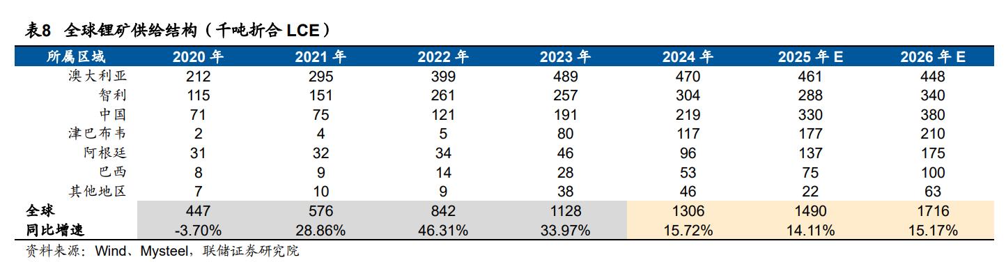 伴随锂价跌至历史性的低位区间同时叠加行业低盈利预期,高成本矿企已经开始收缩生产计划,资本开支逐步见顶。2024年全球锂矿产量130.6万吨,同比增速已降至15.72%。而根据我们的预测结果,2025-2026年,全球锂供给规模将为149、171.6万吨,同比增速将延续2024年的下滑趋势,分别为14.11%、15.17%。整体来看,未来两年虽然行业将依旧呈现过剩局面,但基本面呈现改善趋势相对确定,锂价有望伴随供给增速的趋缓而逐步修复。