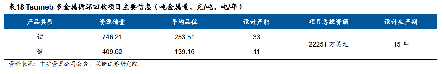 2024年8月,公司通过旗下全资子公司香港中矿,收购获得了Tsumeb公司98%的股权,其核心资产是位于纳米比亚的Tsumeb冶炼厂及其附属的多金属熔炼尾渣堆。2024年12月,公司动工建设Tsumeb多金属综合循环回收项目,产能规模为20万吨/年,项目投资额为2.05亿美元。Tsumeb尾渣堆主要为锗锌渣堆和铜渣堆,含有多种有价金属资源,合计保有资源量294.35万吨矿石量,其中锗金属储量746.21吨,平均品位253.51克/吨;镓金属量409.62吨,平均品位139.16克/吨;锌金属量20.95万吨,平均品位7.12%。矿区配套的Tsumeb冶炼厂基础设施完善,交通运输便利,通过铁路可与大西洋鲸湾港口联接。目前冶炼厂产线为铜精矿炼厂,公司正在对其进行升级改造,建成后设计产能为锗锭33吨/年、工业镓11吨/年、锌锭1.09万吨/年。