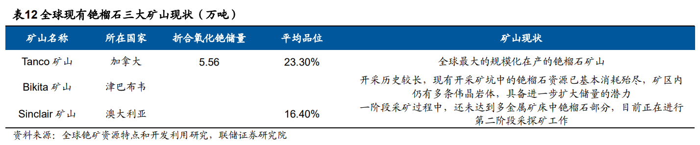 铯资源:主要来自加拿大Tanco矿山和津巴布韦Bikita矿山。