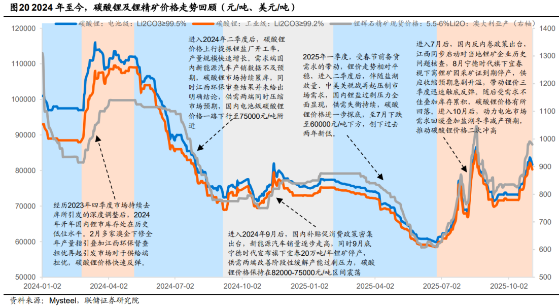 2025年锂价走势波动剧烈,整体呈现先抑后扬的趋势。年初受下游厂商普遍进行的春节前备货需求的带动,国内锂价运行相对平稳。但进入2月后,市场累库压力逐步显现,锂价拐点出现。二季度盐湖产锂放量,矿端价格首先跌破2024年低点,同时特朗普发起全球关税战,市场需求预期受限,碳酸锂价格开始加速下跌,至6月末,国内电池级碳酸锂价格一度跌穿60000元/吨,创下过去两年的新低。进入三季度后,国内反内卷政策出台,江西同步启动对当地锂矿企业历史问题核查,8月宁德时代旗下宜春枧下窝锂矿因采矿证到期停产,供应收缩预期急剧升温,带动锂价三季度迅速触底反弹。随后受需求不佳叠加库存累积,碳酸锂价格有所回落。进入10月后,动力电池市场需求回暖叠加盐湖冬季减产预期,推动碳酸锂价格二次冲高。截止至2025年11月3日,电池级碳酸锂价格为81650元/吨,较年初上涨8.79%;澳大利亚锂辉石精矿价格为980美元/吨,较年初上涨15.98%。