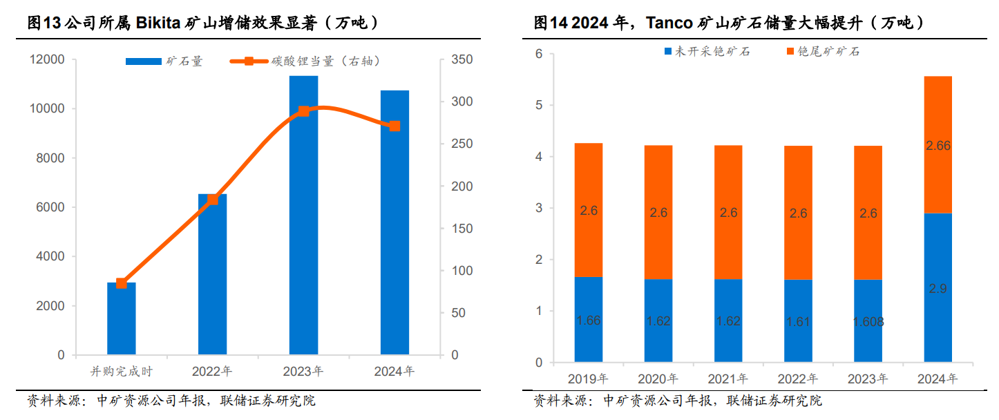 探矿增储成果显著。凭借独具特色的地勘技术优势,公司所属主力矿山在保有期内资源储量均实现显著增长。津巴布韦Bikita矿山自2022年收购以来,已经连续完成了三次增储工作,保有矿石量由2941.40万吨2024年提升至10741.94万吨,碳酸锂当量(LCE)由84.96万吨增长至270.85万吨;2024年,公司对加拿大Tanco矿区进行了露天采矿可行性研究工作,在该方案下,矿区原地保有氧化铯金属资源量由1.608万吨提升至2.9万吨,尾矿氧化铯金属资源量由2.6万吨提升至2.66万吨。