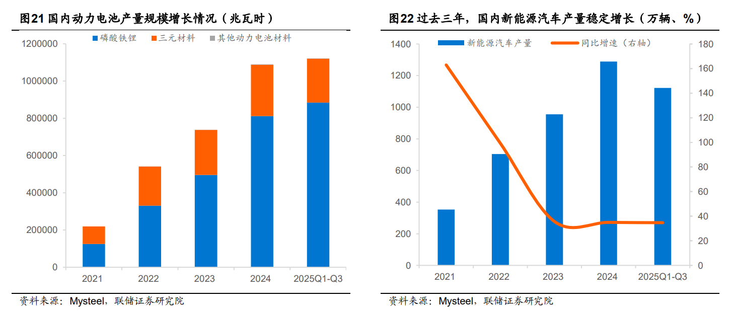 新能源市场需求稳定增长。锂离子电池是锂市场的主要应用场景,过去数年间,相关市场需求持续稳定增长。2025年前三季度,国内新能源汽车产量1122万辆,规模再创同期新高。过去三年间,同比增速持续维持在35%左右。所配套动力电池方面,前三季度,国内磷酸铁锂、三元材料电池合计产量突破110万兆瓦时。考虑当前新能源汽车级储能市场的高景气,未来数年间,锂市场需求依旧有充分增量空间。