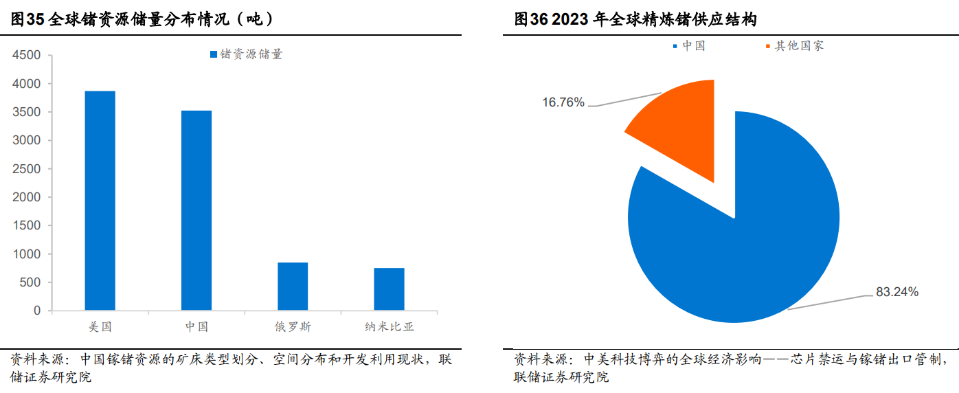 对比下游需求市场的广泛分布,锗的供给结构则极为集中。根据美国地质调查局统计数据显示,全球已探明的锗储量8600-9000吨,美国和中国是主要分布国,分别约占储量总值的43.02%和39.2%。但美国虽为锗资源的最主要保有国,但其将锗定位为战略资源储备,不进行采掘开发,因此我国是全球最大的锗产品生产国。2023年,全球精炼锗产量为185吨,其中中国产量为154吨,占比达到83.24%,在全球供应链体系中占据枢纽地位。