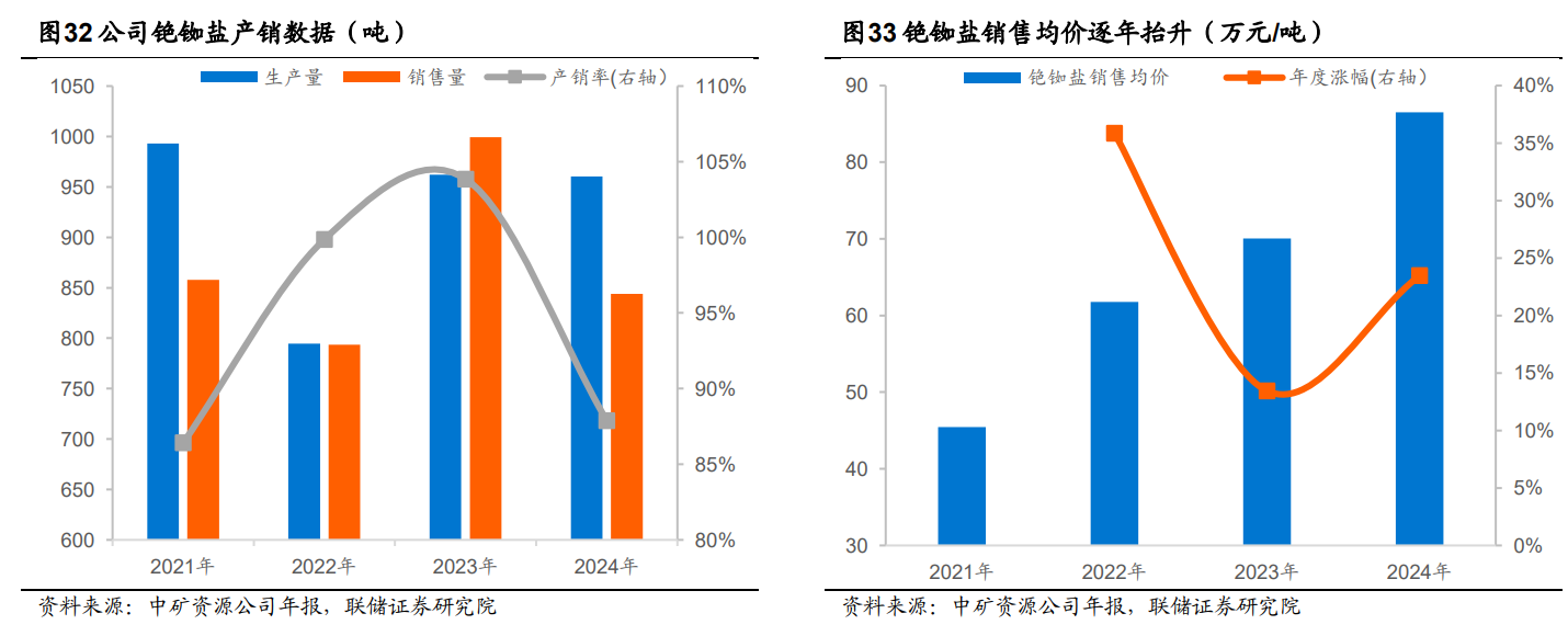 铯:通过掌握上游资源,公司在产业链中近乎享有垄断地位,且伴随扩张产能放量,量价齐升,板块盈利有望再创新高。全球可采铯矿规模极为有限,且分布集中。公司自有的Tanco矿山和Bikita矿山是全球唯二两座规模化在产铯矿山,原料端的优势保证公司在铯铷盐精细化工行业占有绝对的市场份额。目前制约公司铯铷业务进一步扩张的难点主要在于原料供应瓶颈问题,公司于2024年投资建设Bikita矿山铯榴石采选产线,目前项目已完工,爬产完成后,可使公司现有原料供应产能提升50%。铯铷产品产量提升、产品价格的持续上行叠加高端市场的探索,我们看好公司铯铷板块业绩能够持续高增。