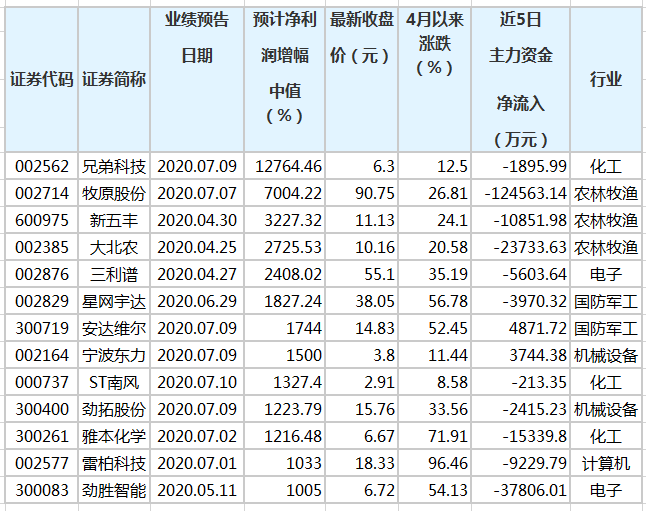 证券时报•数据宝统计显示,截至7月10日,已经有736家上市公司公布了上半年业绩预告。业绩预告类型显示,预增公司229家、预盈31家,合计报喜公司比例为35.33%。业绩预喜公司中,以预计净利润增幅中值统计,共有122家公司净利润增幅超100%;净利润增幅在50%~100%之间的有69家。具体到个股看,兄弟科技、牧原股份等13只个股净利润同比增幅超过10倍。兄弟科技预计净利润增幅最高。