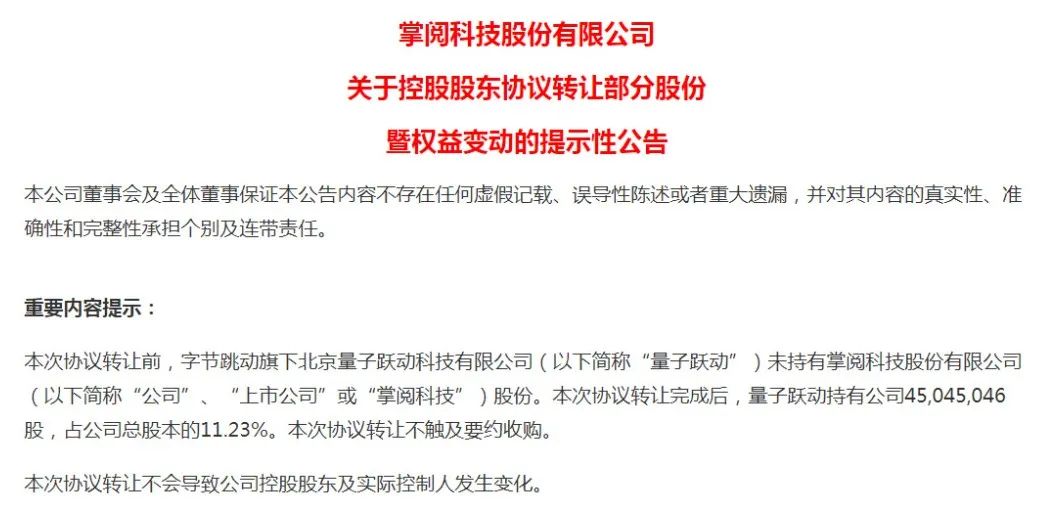 掌阅科技公告,公司控股股东、实际控制人成湘均、张凌云与量子跃动签订了《北京量子跃动科技有限公司与张凌云、成湘均关于掌阅科技股份有限公司之股份购买协议》及补充协议,成湘均和张凌云拟将其分别持有的2252.25万股、2252.25万股无限售流通股份协议转让给量子跃动。量子跃动是字节跳动的子公司,字节跳动持有其100%的股权。交易完成后,量子跃动持有公司4504.50万股,占公司总股本的11.23%。