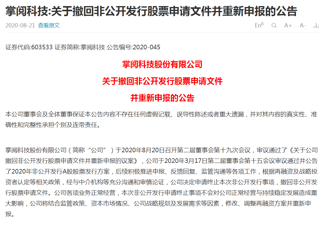值得注意的是,该定增方案一直没有落地。8月份,掌阅科技发布撤回非公开发行股票申请文件并重新申报的公告,公告中称,公司于2020年3月17日公告了2020年非公开发行A股股票发行方案,后续积极推进申报、反馈回复、监管沟通等各项工作,根据再融资及战略投资者认定等相关政策,经与中介机构等充分沟通和审慎论证,公司决定申请终止本次非公开发行事项,撤回非公开发行股票申请文件。公司各项业务正常经营,本次非公开发行申请终止事项不会对公司正常经营与持续稳定发展造成重大影响,公司将结合监管政策、资本市场情况、公司战略规划及发展需求等因素,修改、调整再融资方案并重新申报。